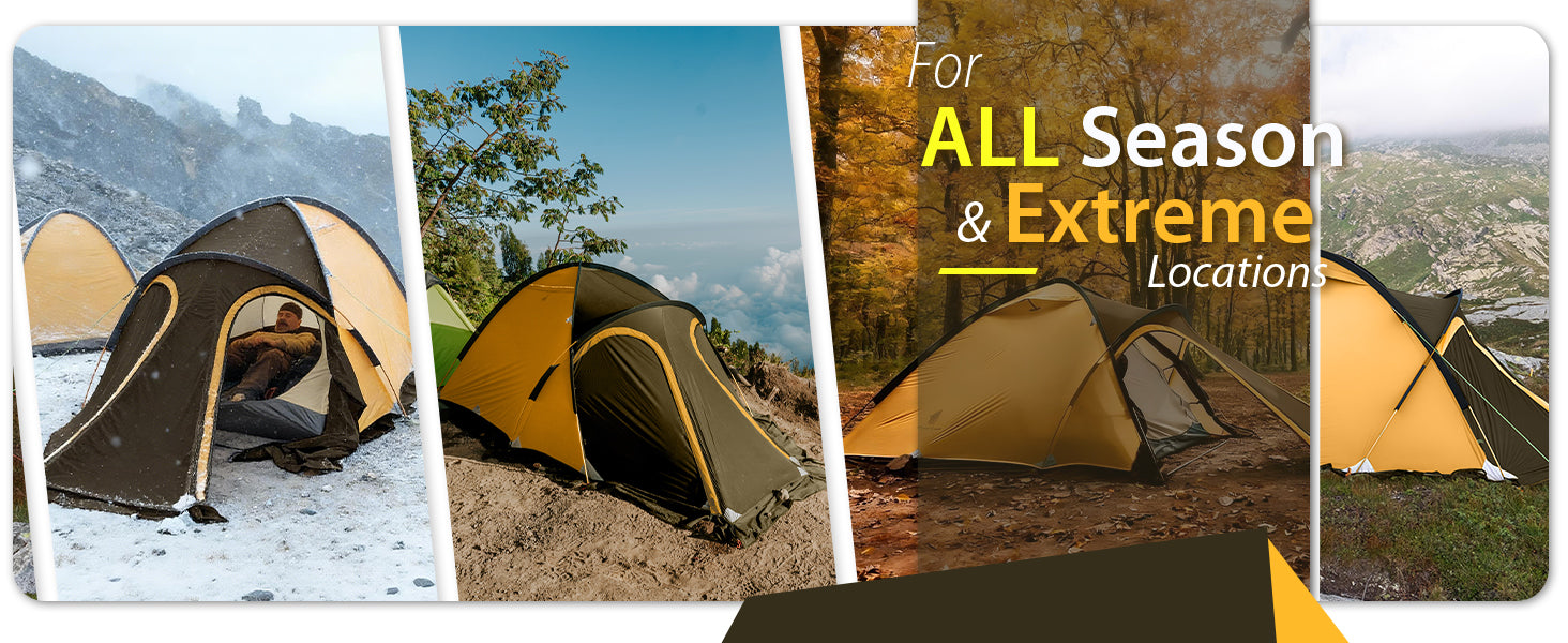 【4 Season Tent】This 4 season tent built in snow skirt around + breathable nylon mesh which makes it great for cold, snowy or warm weather; Double stitched, tape sealed seams ensure a waterproof seal in cold weather ; With strong and stable Aluminum poles
