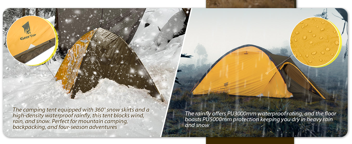 【Waterproof Camping Tent】Geertop 2 person 4 season tent made of 20D PU8000 mm waterproof coated nylon for Outer tent & 210T PU 5000 mm waterproof coating polyester for tent floor, be able to resist strong wind or snow in high altitude camping situations