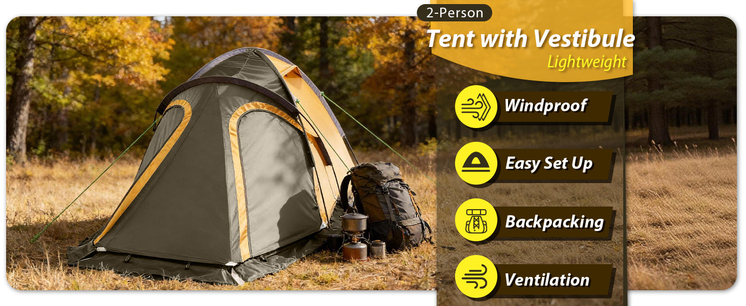【 Easy to Set Up 】DOUBLE LAYERS tent - Inner tent + Outer Tent Fly, please note that the inner tent color is yellow,please set up the outer tent first, one person can easily set up the tent & flysheet in a few minutes, to save more time for the camping trip