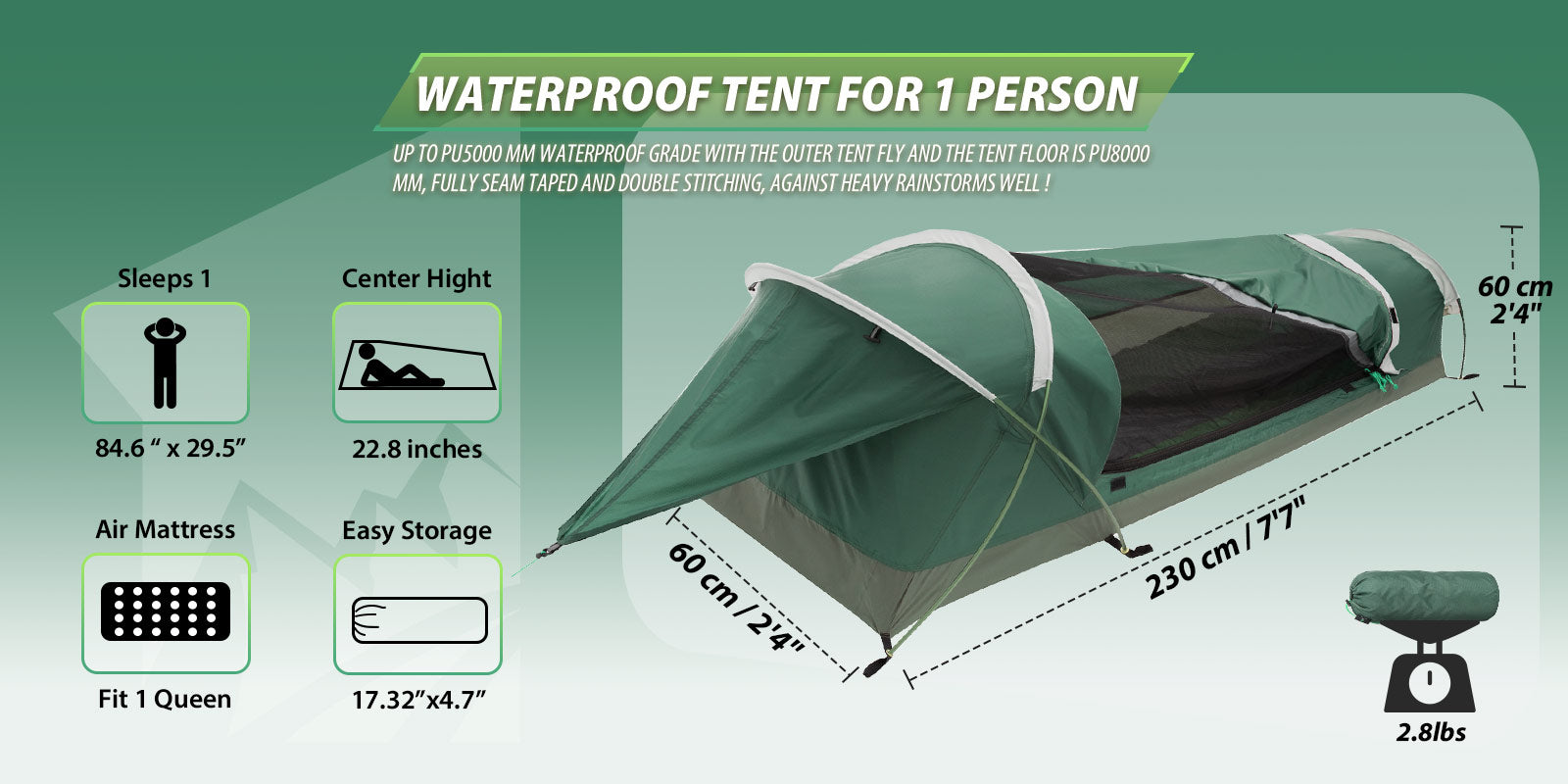 - Floor: 240T PU8000MM Polyester, seam taped, double stitching.