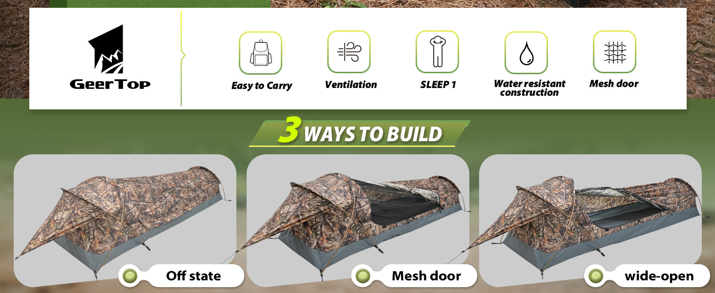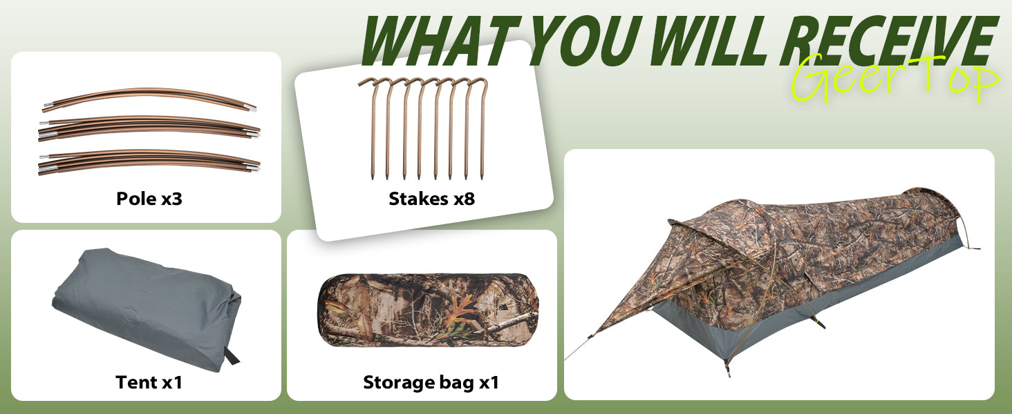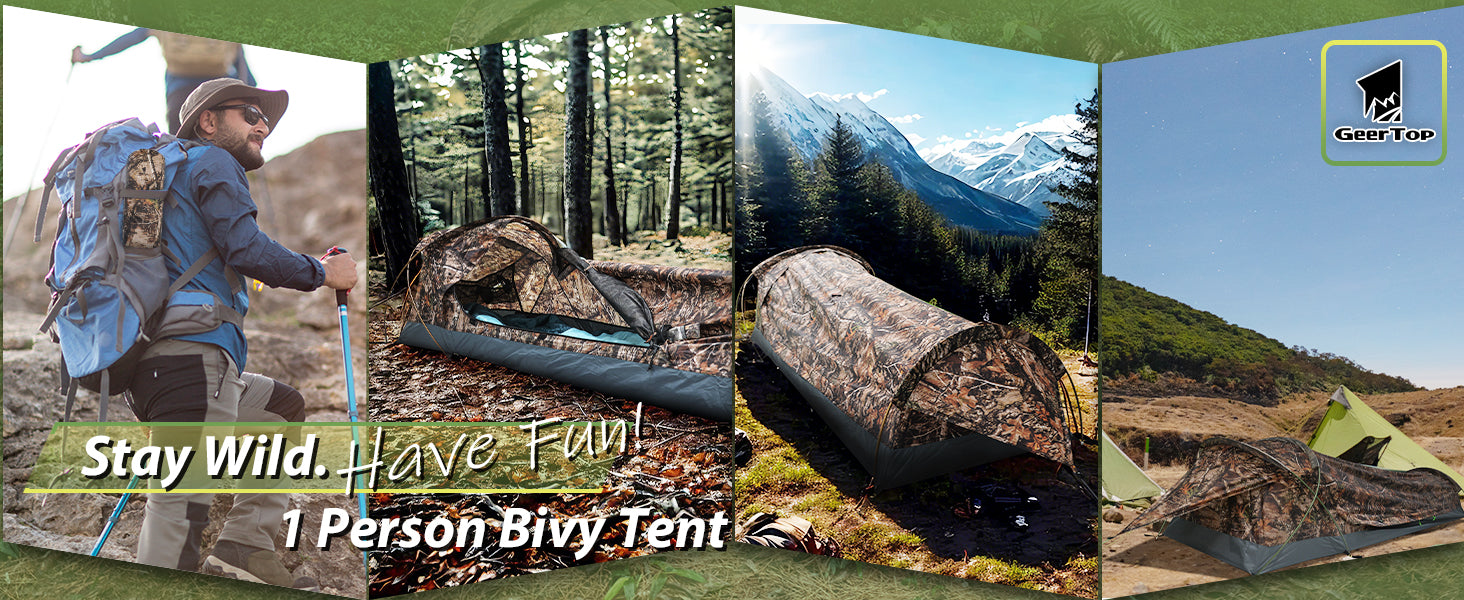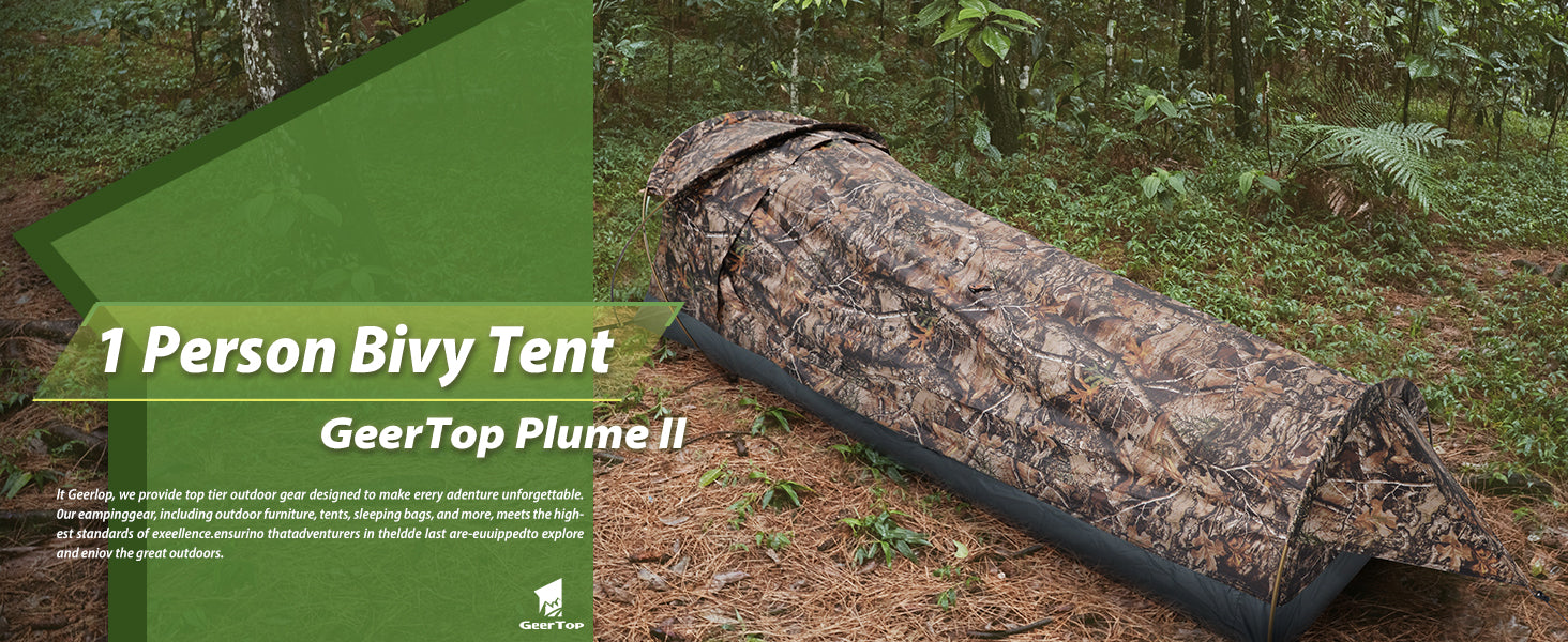 GeerTop BivyII tent has features such as lightweight aluminum poles, durable stitching, full length flysheet, and taped seams for extra waterproofing.