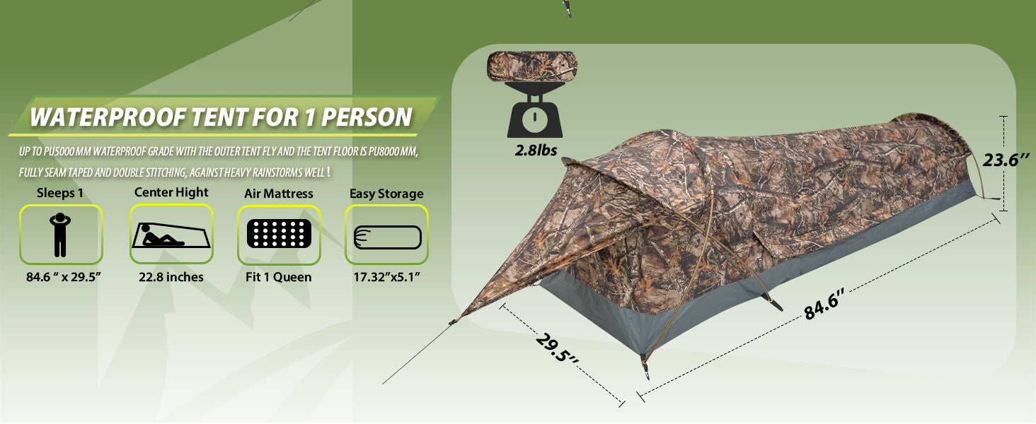 【Large 1 Room Space】The Tent measures 84.6 In(7 ft) x 29.5 In(2.5 ft)with a height of 24 inch,suitable for single man, enough room space to turn over, eating or reading. More comfortable and give a wonder sleeping camping experience for you
