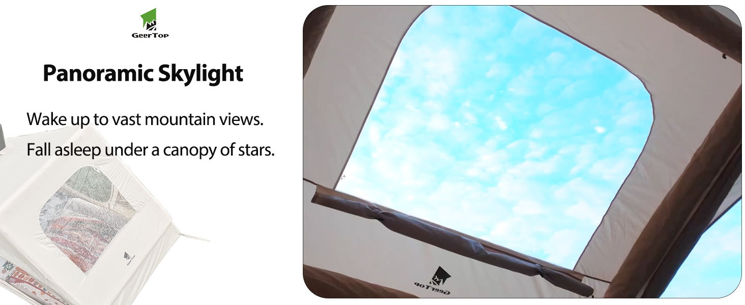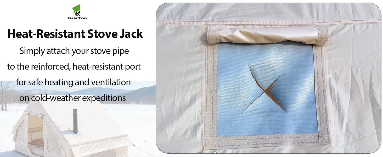 Meet the Geertop Instant Setup Inflatable Hot Tent—your 4‑season home under the stars. This 4‑6 person cabin-style tent sets up in just 2 minutes with an air pump, no poles needed. Featuring a built‑in stove jack for safe winter heating, a large transparent Sky‑View window, and durable waterproof construction, it’s designed for everything from cozy family camping to snowy mountain adventures.